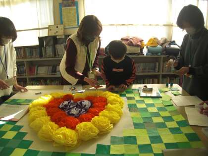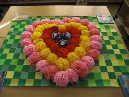 ピンク・黄・赤・紫のお花でハートを作り、まわりは折り紙で市松模様風に仕上げました。すてきな作品が完成しました。