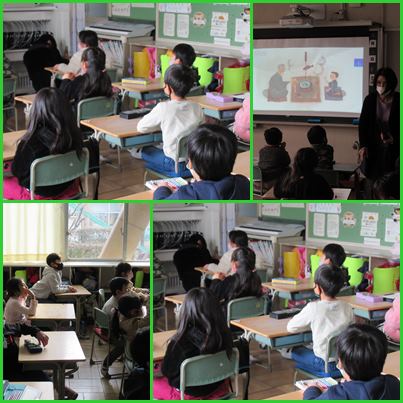 落語家が語る昔話のビデオを見ています。みんな夢中になってスクリーンを見ています。中には、身を乗り出して見ている子も。