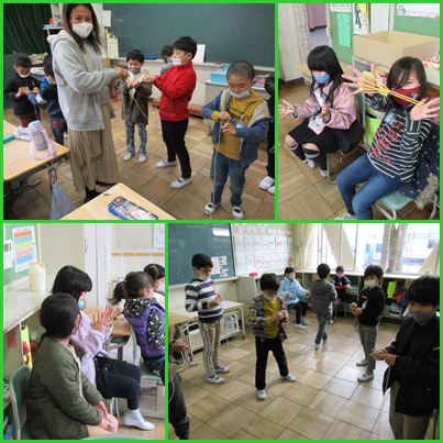 あやとり・おてだま・こま回し。あやとりは上手にできましたが、こま回しは苦戦していました。ひもを巻き付けるのが難しそうです。
