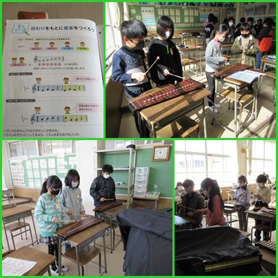 役割分担をして合奏をするのですが、今はリコーダーや鍵盤ハーモニカが使えません。木琴やトライアングルなどの打楽器を使って、それぞれ工夫して合奏をします。