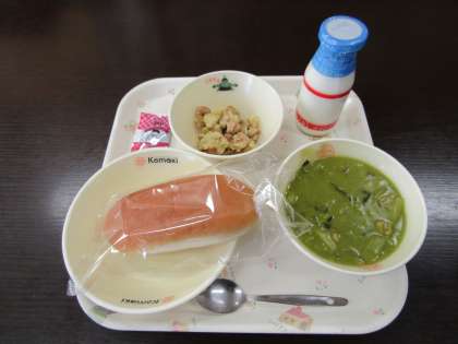 ほうれん草のポタージュ、ロールパン、牛乳、