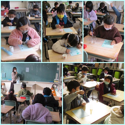 点や線など基本的な筆使いを練習したら、「くつ」という文字を書いてみます。