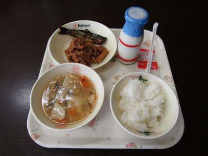 のっぺい汁、ニジマスの甘露煮、牛乳、
