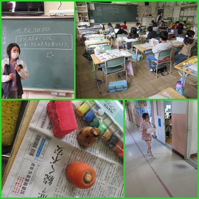 「ぺったんコロコロ」の学習です。それぞれ準備したものをスタンプにして、いろいろな形を見つけます。