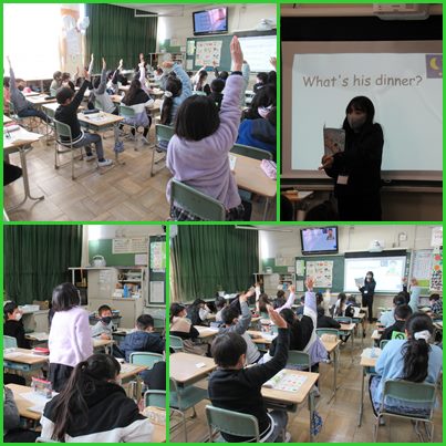 教科書の絵を見ながら、夕食に何を食べたか探しています。答えは日本語でもOK。「魚」「ライス」・・・よく見ると「キャットフード」?