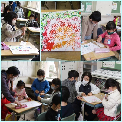 いろいろな材料で形を写したりこすり出したりした模様からイメージしたものを絵に表しました。