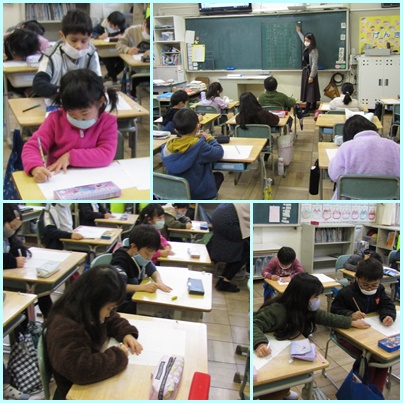 今日は、「一しゅうかんのかん字うた」を視写しながら、これまでに学習した漢字や平仮名を字形を整えて書く練習をしています。