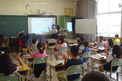 2組は外国語活動。ALTのリザ先生と一緒に。