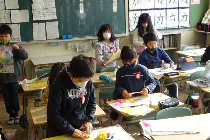 1組は図工。紙版画の制作中。