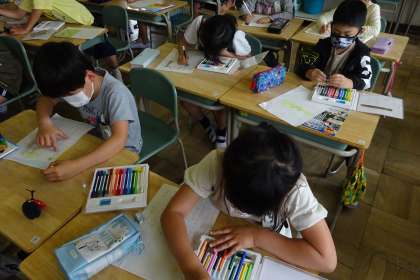 1組は校外学習の振り返り。絵日記にまとめ中。