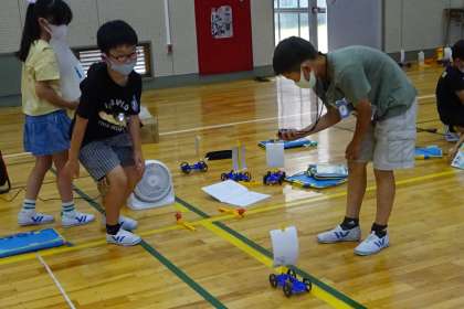 風で動く車を作り、車に当てる風の強さや当てる時間などを変えて、車の動き方の違いを調べる実験中。