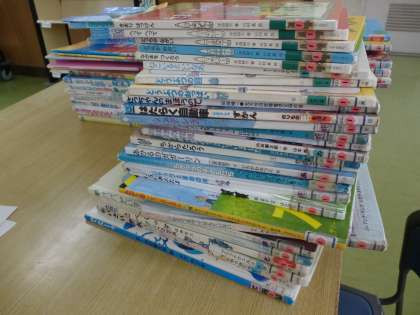 今日は、学校図書館司書の先生が3人いらっしゃって、熱心に作業をされていました。学級文庫の本を入れ替えるために、ラベルの貼り替えをしているそうです。今度、学級文庫の背表紙を見てみましょう。ピンク、水色、黄色のラベルが貼られていることに気づくと思います。2学期は、1組が水色、2組が黄色、3組がピンクのラベルになります。