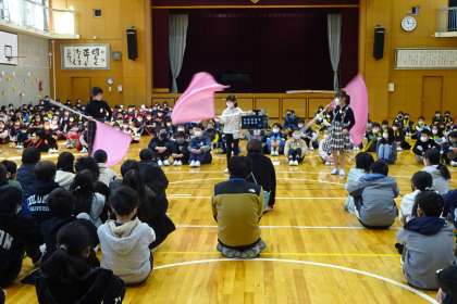 クラブ活動でのエピソードをユーモアたっぷりの寸劇に仕立てて会場を笑いで包み、力強いソーラン節を披露して6年生にエールを贈りました。