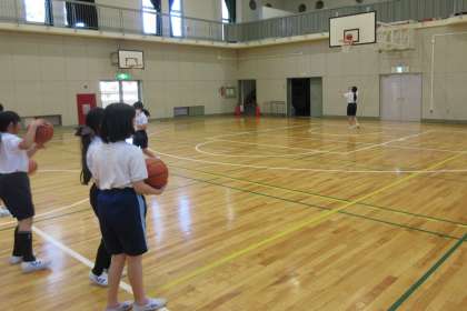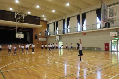 バスケットボール部は、全部員が体育館に集まってシュート練習。