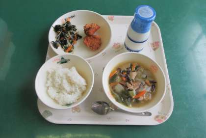 今日の献立は、ごはん、牛乳、八宝湯、鶏肉の唐揚げ、中華サラダ です。