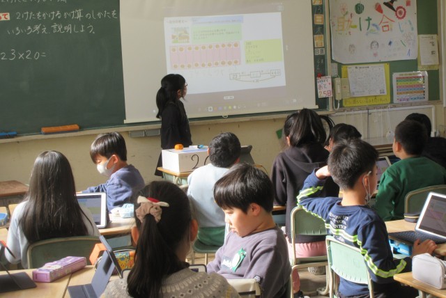 タブレット端末を活用し、友達と考えを聴き合いながら、いろいろな計算の仕方を考え、一番分かりやすい方法はどれかを話し合いました。
