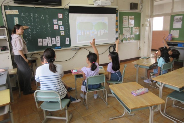 セミ採りや海水浴。夏の楽しげな絵の様子について、漢字を使って文を書く練習中。