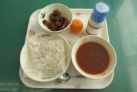 今日の給食は、ごはん、牛乳、フォーと野菜のスープ、鶏肉と大豆のごまがらめ、りんご...