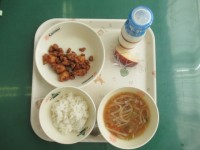 今日の給食は、ごはん、牛乳、フォーと野菜のスープ、鶏肉と大豆のごまがらめ、りんご です。
