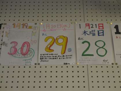 3年生の教室には「卒業まであと何日」というカウントダウンカレンダーが掲示されています。もうあと24日しかない!ふと掲示物をみて、「もうそれだけしかないのか」と痛感させられました。今日のように受験で全員そろわない日も多くあります。よりいっそう1日1日クラスで過ごせる時間を大切にしていきたいと思いました。最後まで3年生として学校生活を楽しみ、そして学習に真剣に取り組み、後輩たちにそんな姿を示していけるといいですね。