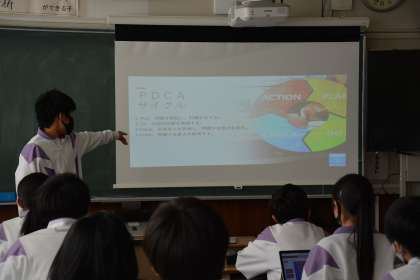 興味があることや卒業後の進路先など、生徒自身が調べたいものをパワーポイントでまとめ、クラスごとに発表しました。聞く側も初めて知ることも多く、友達の発表を熱心に聞くことができました。