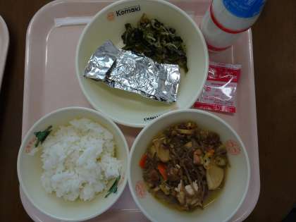 今日の献立は、ごはん、牛乳、名古屋コーチンのひきずり、さばの銀紙焼き、ほうれんそうのじゃこあえ、いちご牛乳のもとです。