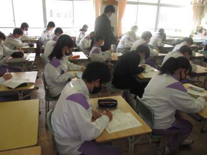 3年生は愛知県の私立高校推薦入試を終えた生徒が続々と合格報告をしてくれました。笑顔いっぱいで嬉しそうに報告に来てくれました。その後、教室に入ると雰囲気は一転して、鉛筆の音だけが静かに響くそんな雰囲気で各クラス学習に取り組んでいました。来週からは一般入試が始まります。多くの人が受験にのぞみます。最後の追い込みにみんな必死です。くれぐれも体調には気をつけて力を出し切ってほしいと思います。