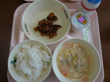 今日の献立は、ごはん、牛乳、豆乳なべ、鶏肉とさつまいものごまがらめ、蒲郡みかんゼリーです。