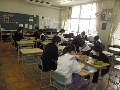 3年生は今日で私立高校入試の3日目になります。教室の中がさみしいのは今日で最後、明日からは久しぶりにみんなで授業ができます。少し広く感じる教室でのグループ学習は、人数は少なくても、どの子も一生懸命学び合っている様子です。