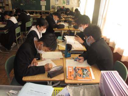久しぶりの全員そろっての教室、わからないことをお互いに確認しながら、楽しそうに学ぶ姿がありました。自分だけで学び、実力をつけていくことの大切ですが、みんなで学ぶのはやはり楽しい。そんな様子が見られた3年生の授業の様子でした。