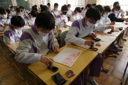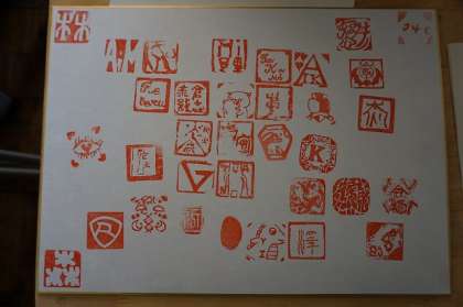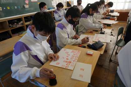 美術の時間に彫った印を色紙に押しました。クラス全員の印がそろうと、とてもきれいです。岩崎中での思い出がまた一つ増えました。