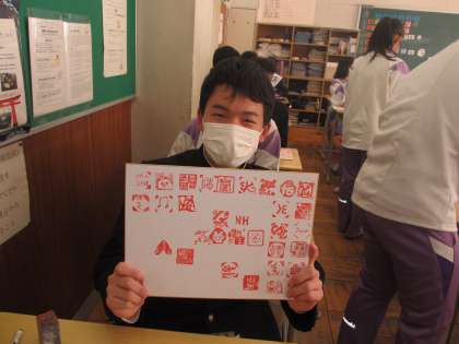 3年生は美術の授業でつくった篆刻をそれぞれのクラスでみんなで色紙に押しました。クラスメイトみんなの作品が集った色紙はきっと宝物になることでしょう。嬉しそうなこの笑顔、クラスの楽しい雰囲気が伝わってきます。それぞれのクラスで仲間と一緒に過ごせるのもあと2週間、1日1日を大切に過ごしていきましょう。