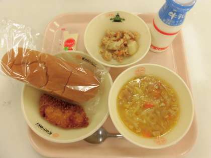 今日の献立は、くろロールパン、牛乳、野菜スープ、白身魚フライ、ポテトサラダ、1食用マヨネーズです。