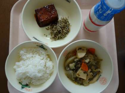 今日の献立は、ごはん、牛乳、よせ鍋、生揚げのみそかけ、じゃことごまのふりかけです。