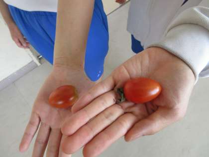 4組の探検は、パークアリーナ方面です。田んぼでとても美味しそうなトマトを頂きました。