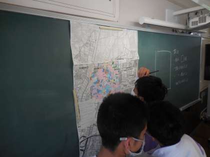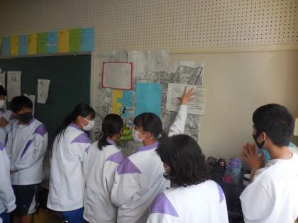 自分たちが調べてきたことを他のクラスに伝えるために、クラスで協力して岩崎校区の地図を作成しています。