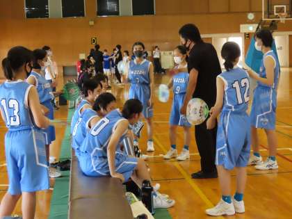 7月3日(土)、勤労センターで行われた夏の市内大会の初戦女子バスケ部は春の大会の時と同じ応時中学校と対戦しました。序盤から激しいディフェンスからボールを奪いリズムにのり、得点を量産します。ミスをしても、その後すぐにボールを奪い返し、走ることを徹底することを課題に練習してきた成果が出ました。第1ピリオドを終えて37対7と点差は開きましたが、その後も少しも気持ちをゆるめることなく走り続け、攻め続け、第3ピリオド終了時点で100点奪うというハイペースな試合をすることができました。今大会は無観客試合です。3年間選手を支えてくださり、いつも応援してくれた保護者の方が最後の舞台を見ることができないことを本当に心苦しく思います。ただ、選手たちはいろいろな人の思いを背負い堂々たる姿で勝利をつかみました。最終ピリオドでは、1年生も全員出場し、連続得点をあげるなど活躍し、終わってみれば123対20の快勝でベスト4進出を決めました。3年生全員が二桁得点をあげる順調な攻撃力を見せることができたことが大きかったと思います。明日の準決勝に勝てば愛日地区大会出場が決まります。勝負のかかった明日、あふれんばかりの気迫を見せてくれることを期待しています。