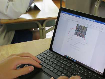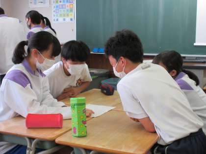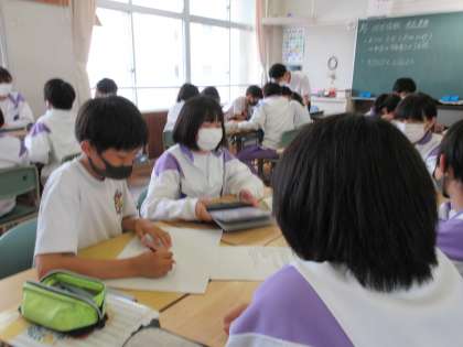 「校区探検」で自分たちが見てきたもの、感じたことをまとめます。何気なく通っている通学路の中から、色々な発見ができたようです。時間を計りながら、原稿を読んでいるグループもありました。