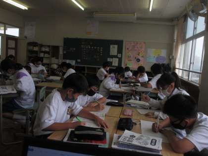 1年生は来週の火曜日に行われる学習コンクールに向けて、日々数学の学習に取り組んでいます。わからない問題を教え合ったり、解き方を話し合ったりするなど、学年みんなで合格できるように頑張っています。学年生徒会は学年生徒会通信を出し、楽しく学習に取り組めるよう呼びかけるなど工夫をこらしています。1つのことにみんなで頑張ることで学年の絆を深めていけるといいと思います。