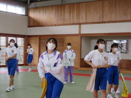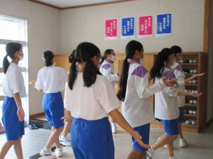 体育の授業で「ダンス発表会」を行いました。今日まで5時間練習をしてきました。曲に合わせて、傘やタオルを使い、表現がより良いものになるように頑張っていました。