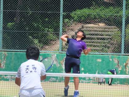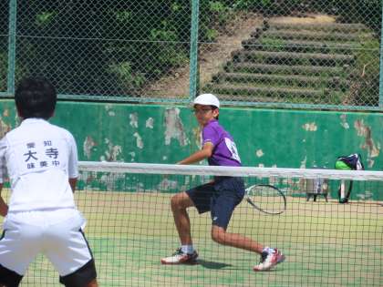 暑い日差しのもと、瀬戸市民公園のテニスコートで、ソフトテニス部男子ががんばりました。