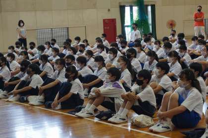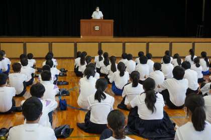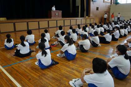 コロナウィルス感染防止対策のため、1年生は単独で終業式を行いました。夏の大会等の表彰は2・3年生が参加した終業式で行ったので、1年生の終業式は校長式辞のみで、短時間で行いました。体育館の中は、かなり蒸し暑い状態でしたが、最後まで集中して校長先生の話を聴くことができ、1学期間の成長の跡が感じられました。