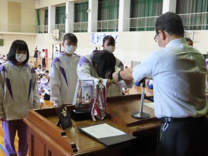 暑い中でしたが、2・3年生と1年生を分けて、2回の1学期終業式を行いました。校長式辞では、どちらもコロナ禍で毎日一生懸命頑張っている生徒たちに、ねぎらいの言葉がかけられました。また、突然の雷雨や豪雨、台風や熱中症など、自分の身に降りかかることに対して、自分で判断し、自分の身を守る行動がとれるようになってほしいという想いを伝えられました。