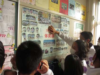 1年3組の教室では、担任の先生が子どもたちのためにつくった掲示物を大喜びで見て笑い合う姿がありました。とても温かい雰囲気が感じられました。