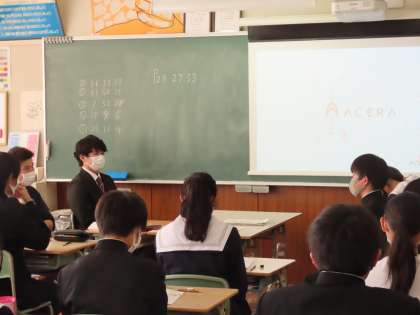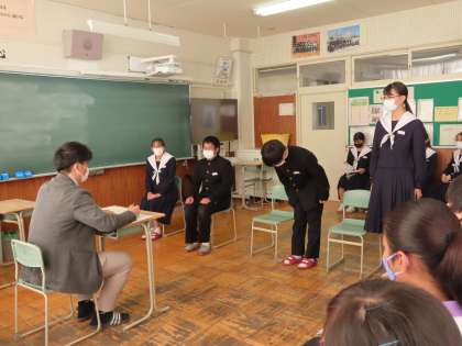 教材に書き込む学級の他にも、実際のグループ面接の場面を想定して、練習に取り組む学級もありました。実際に入室をし、試験管に扮した担任の先生からの質問に答え、退出するところまでを行います。