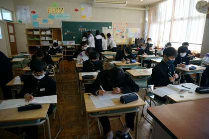教室廊下で通知表が渡されている中、教室では静かに黙々と冬休みの課題に取り組む生徒たち、早めに宿題を終わらせて家族や友達とゆっくり過ごせる時間をつくっていきたいですね。