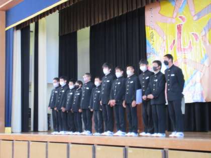 3年生からバトンを引き継ぎ、各部活で2年生も頑張っています。市内大会や文部科学大臣杯などで表彰を受けた、バレー部・野球部・サッカー部の選手たちの活躍を称えました。