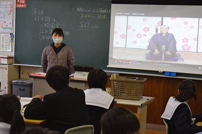 1年生の道徳の授業は、「庶民の笑いを絶やさない」という落語家の方を題材として行われました。伝統を大切にしつつも、今の時代に合わせていく落語家の生き方、あり方について考えを深めました。落語というものを知らない人が多く、興味深そうに授業で使われた動画などを見入っている姿がありました。