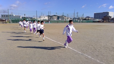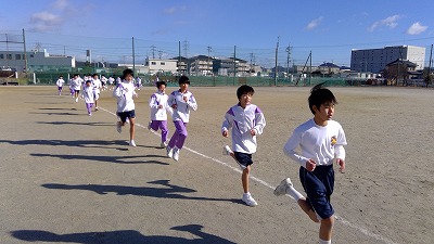 運動場で持久走を行っている1年生、寒さに負けずしっかり頑張りました。しっかり体を動かして体力をつけ、健やかに毎日過ごしてほしいと思います。