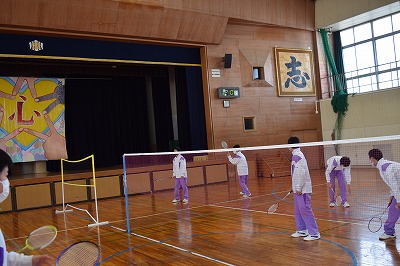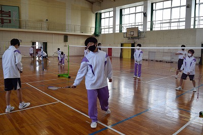 1年3組、4組の体育の授業は今日が初めてのバドミントンの授業だったようです。とりあえずどれくらいできるのか。実際にどれだけ続くのか、ダブルスで対戦をして楽しみました。はじめの授業ということもあってなかなかつながりませんが、果敢にスマッシュを打とうとチャレンジする人や決めた時に喜びの声をあげるなど、意欲的な姿がありました。